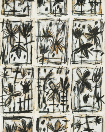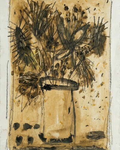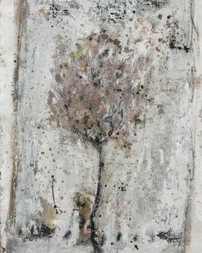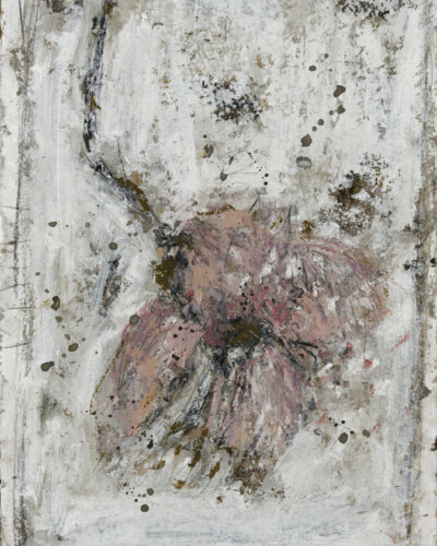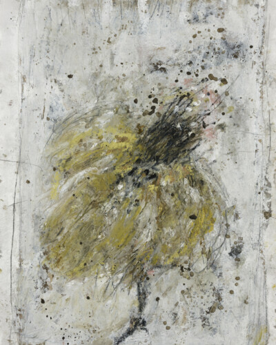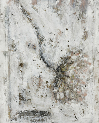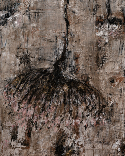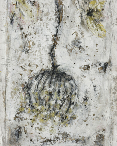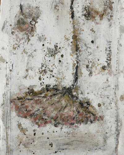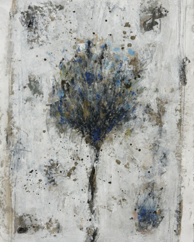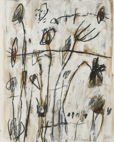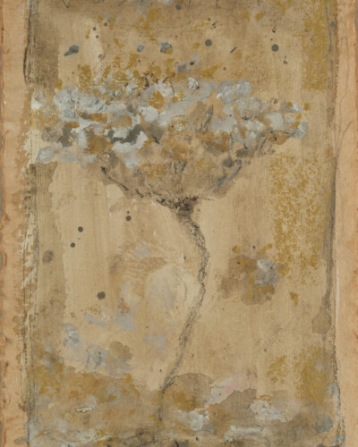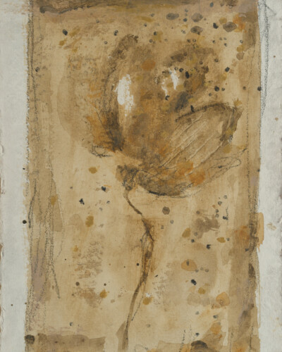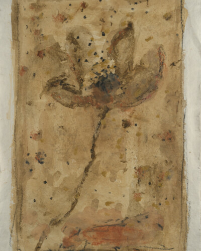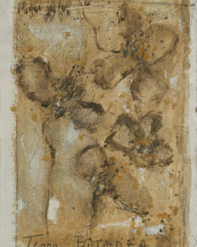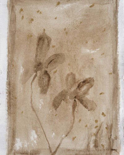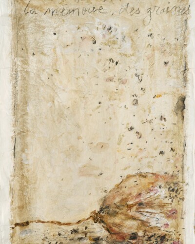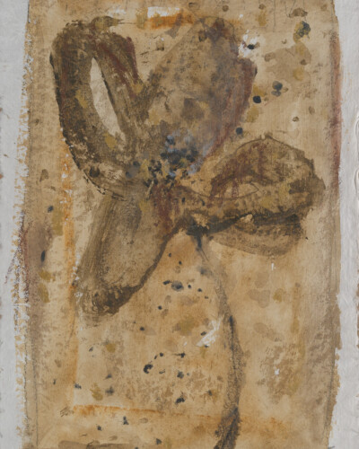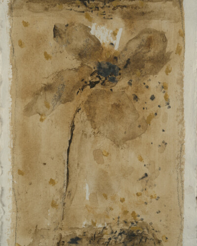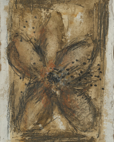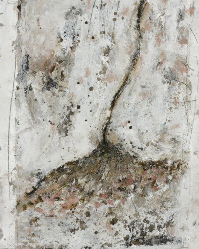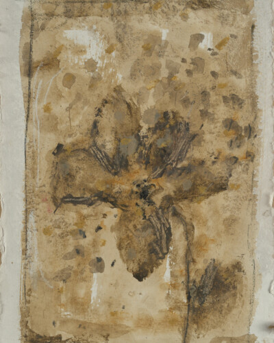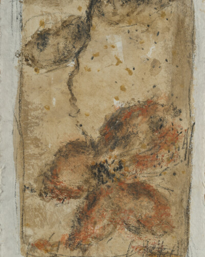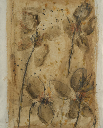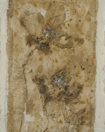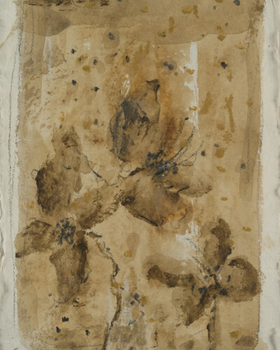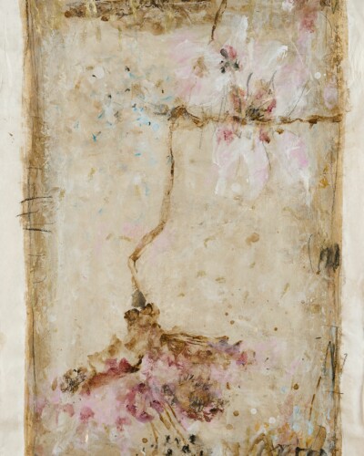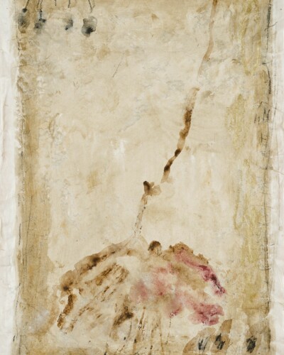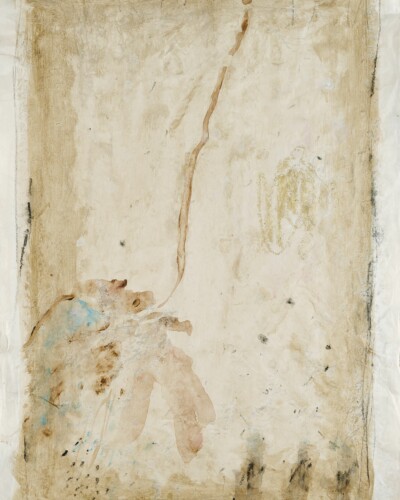 Peinture acrylique et pastel à l'huile sur papier frangé infusé dans du thé